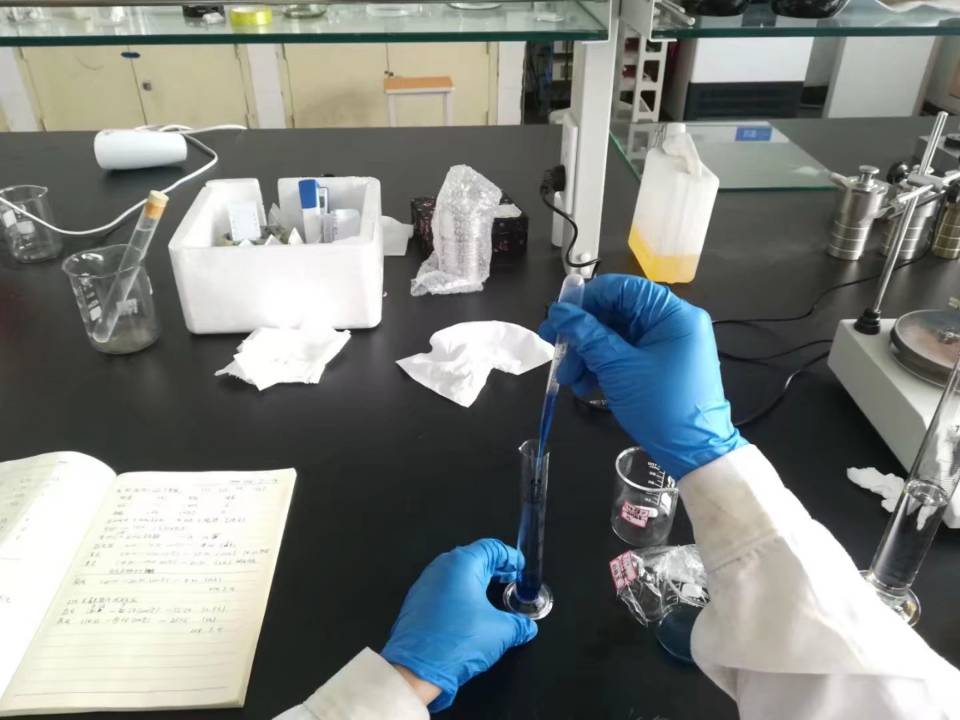 2018年7月15日,伴随着夏日的朝阳和微风,“材”能探索队的实验人员非金材161班的杨颖男带领实践团成员们前往实验室准备进行实验操作及记录。炎热的实验室里充斥着药品的气味,但这并未影响大家的实验热情,实验员坚守岗位,毫不懈怠。待准备工作后,实验操作正式开始。首先制备基础溶液,然后依次对溶液进行搅拌、冷却、离心分离、清洗沉淀、高温煅烧,得到干燥的五氧化二钒后,再对它进行硫化得到八硫化五钒,最后进行材料整合,经过一系列的操作,最终得到成品电池,实验圆满结束。