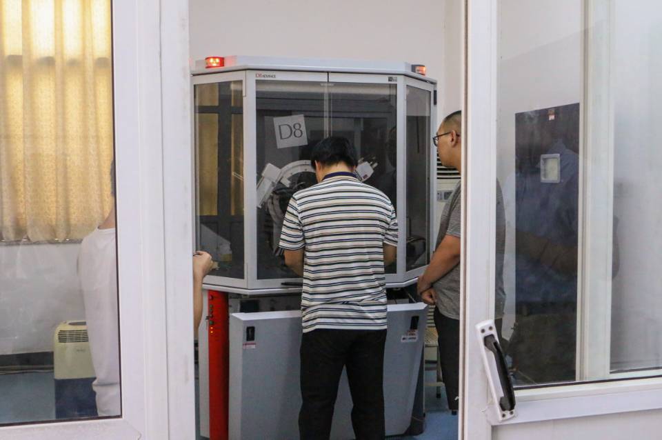 柳勇老师向大家介绍X-射线衍射图谱具有获得材料的成分,材料内部原子或分子的结构或形态等信息的功能,X-射线衍射图谱简称XRD,获得此类图谱需要实验人员熟悉掌握X-衍射仪的操作方法。柳勇老师言传身教,亲身示范。在规范实验着装后,他逐步向大家展示实验流程:建立适宜的实验条件、开启冷却水、开启XRD电源、启动计算机、数据处理、图谱导出、结果分析。经过科学探索,“材”能探索队,享受了一场科学盛宴,这不仅仅是一次视觉的神奇体验,更是对科研求知的督促。